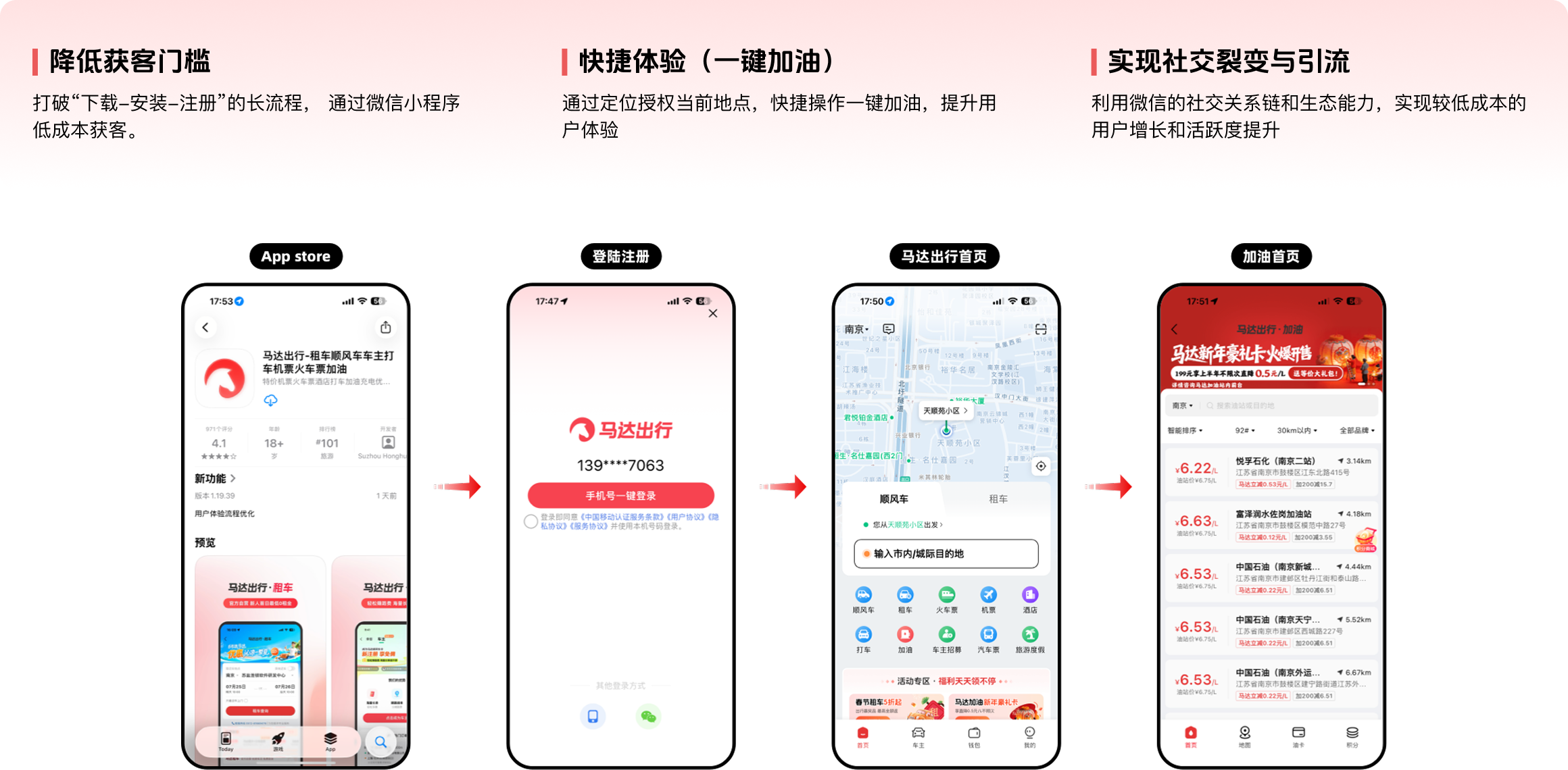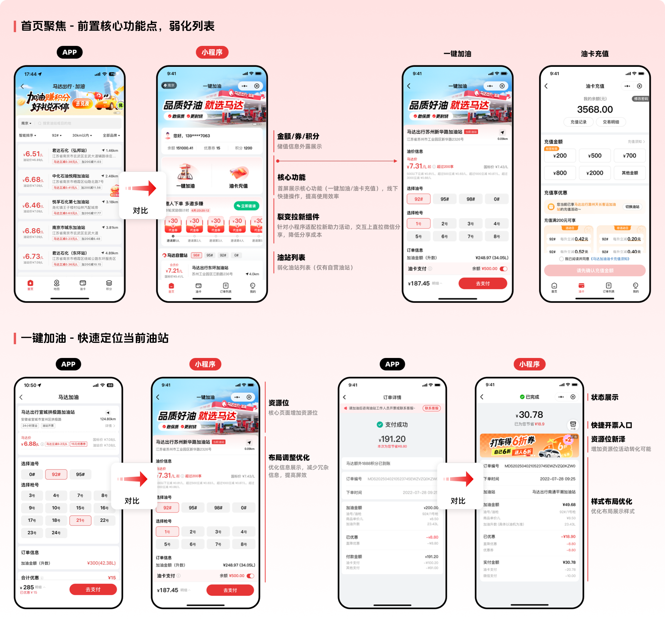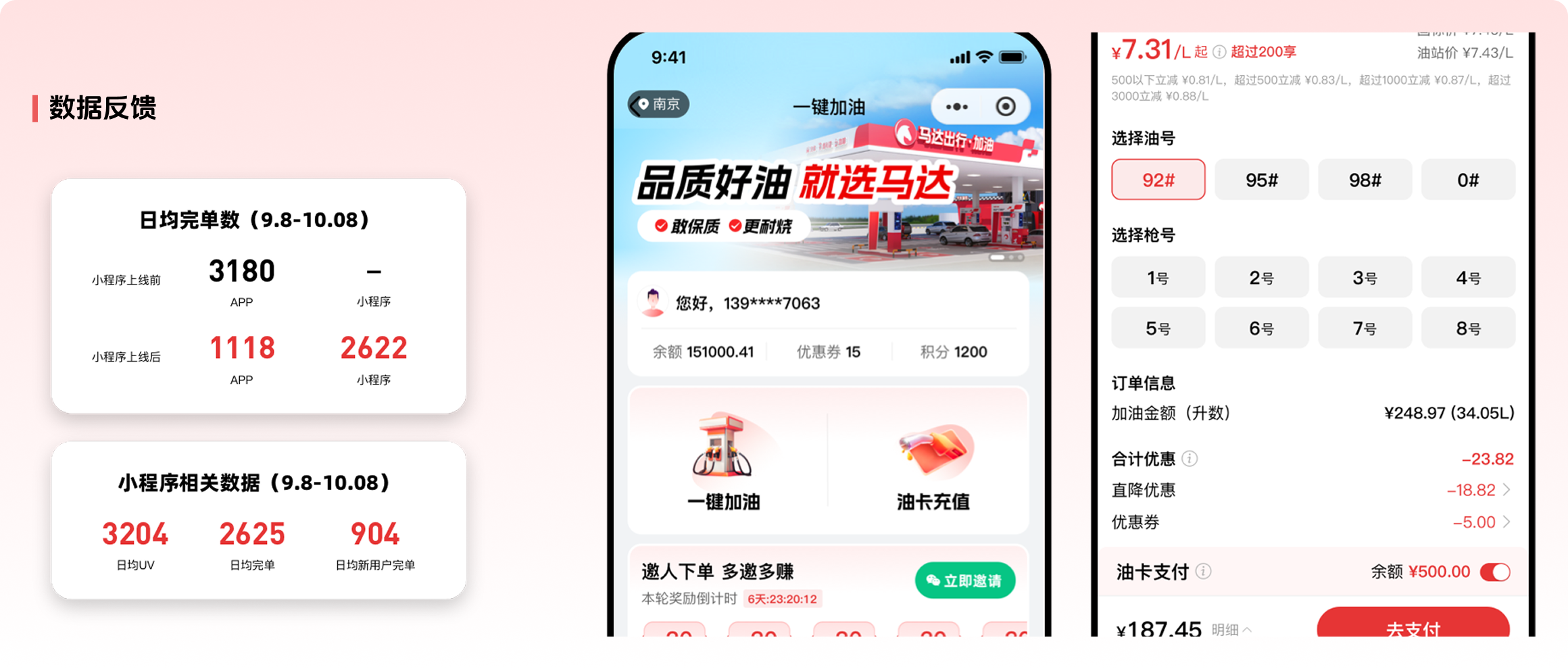 经过调研发现,83%的用户都因App成本下载较大,不愿选择在App完成加油流程,更多还是去窗口支付,流失用户较多,为提高用户粘性,搭建马达加油微信小程序