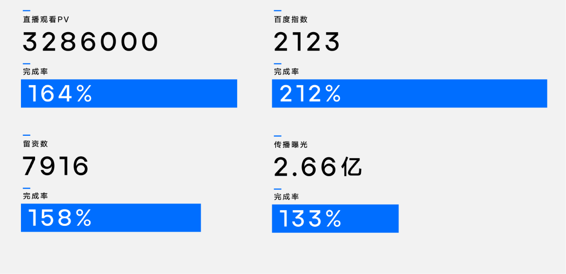 发布会当天,直播观看人数:3286000 超预期完成 64 %、百度指数 2123 超预期完成 112% 、 官网当天留资 7916 超预期完成 58 % ,全平台及媒介传播曝光累计达到 2.66 亿